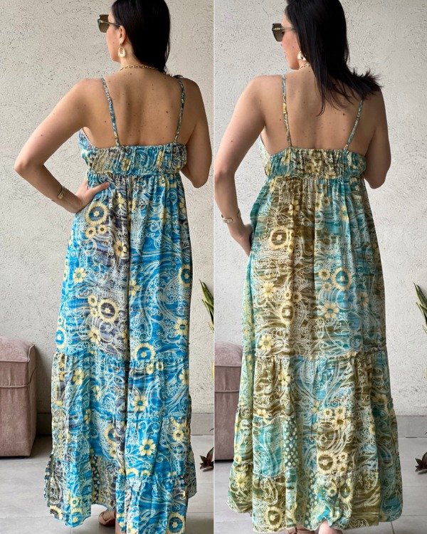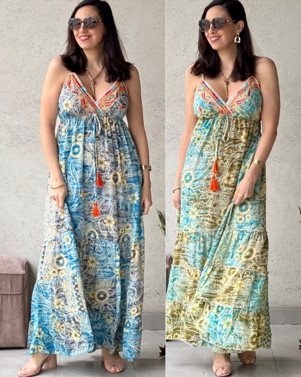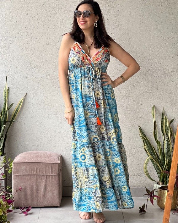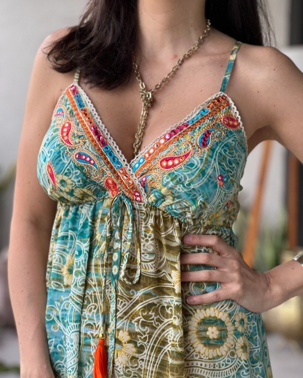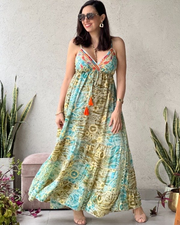 - Solero de Seda India Linea Gold con detalles dorados en su estampa y bordados en pechera y en el largo del vestido