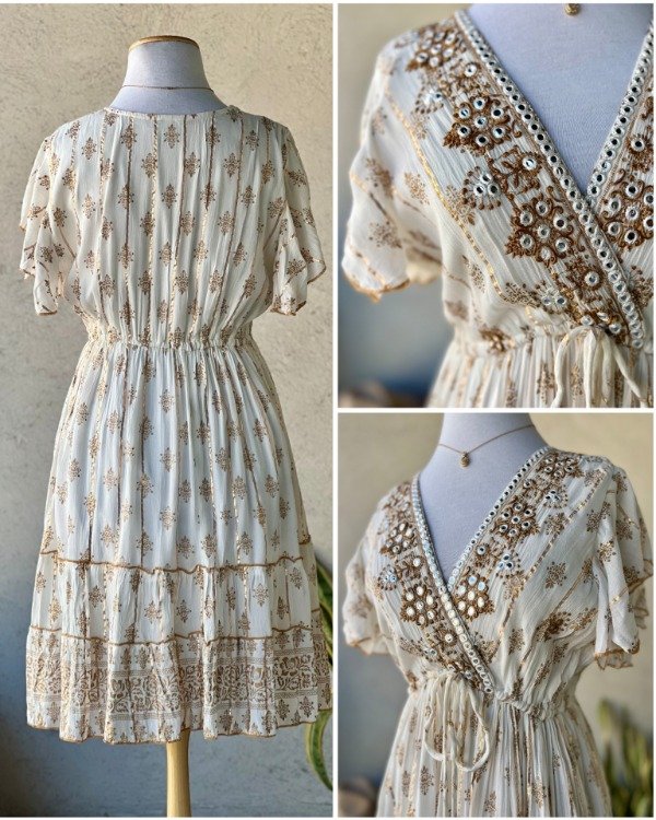 - Vestido estilo Folk 100% algodón indio, línea Gold, con detalles dorados en su estampa.