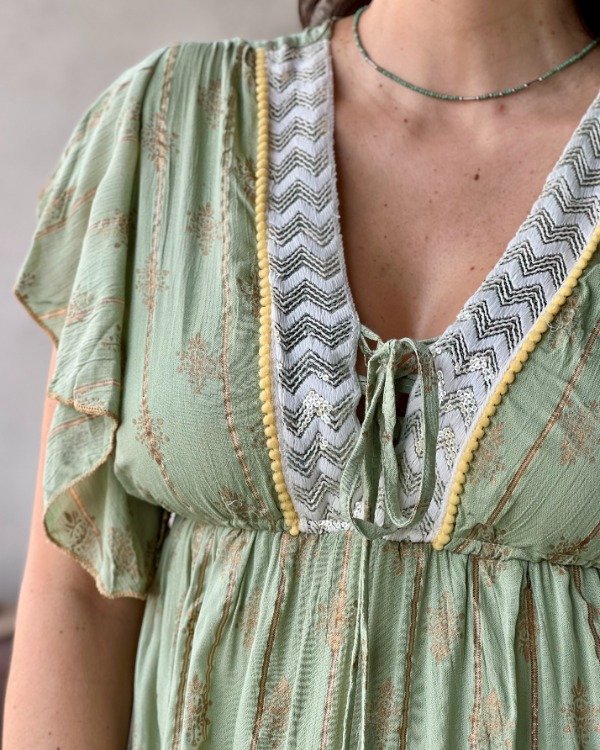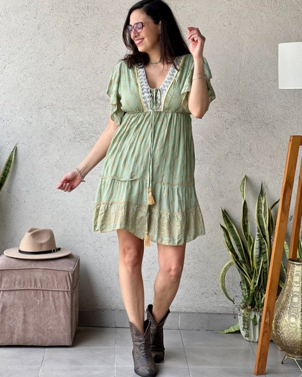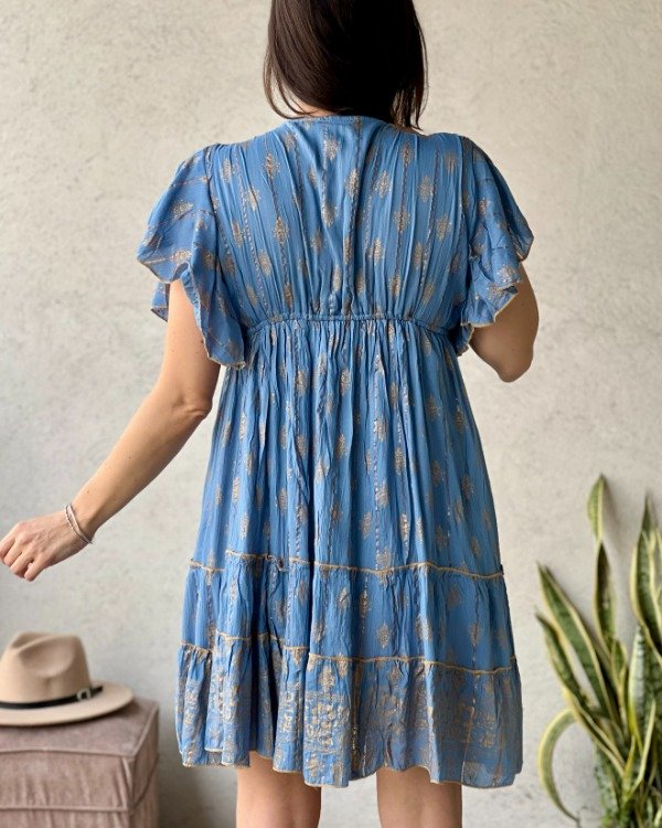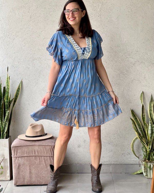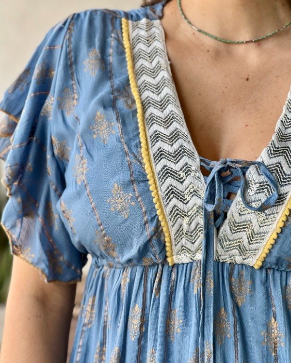 • Vestido estilo Folk 100% algodón indio, línea Gold, con detalles dorados en su estampa.