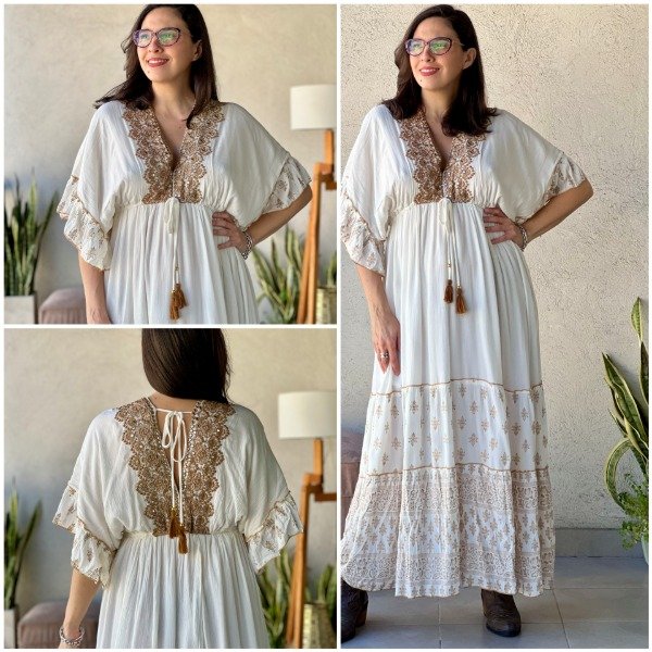 - Vestido de algodón Indio con detalles bordados en pechera y detalles línea Gold en faldón.
