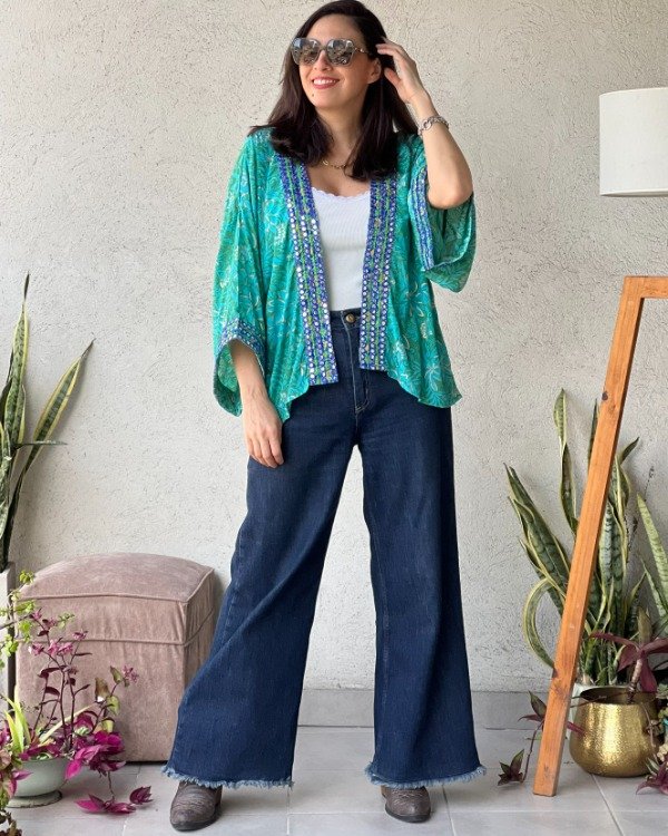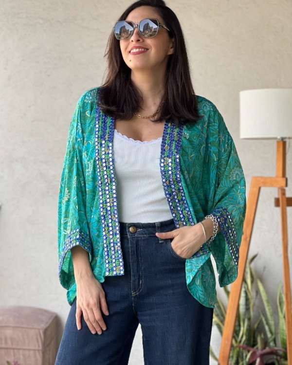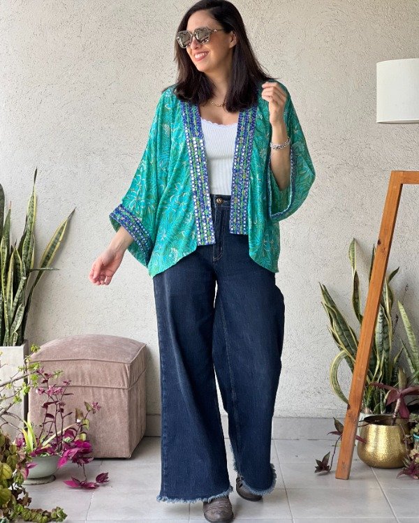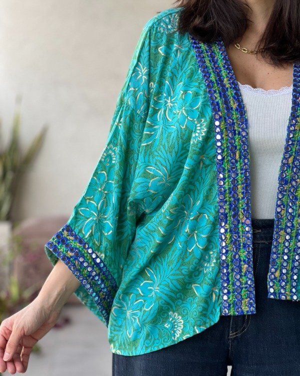 • Kimono Corto de Seda India Linea Gold con detalles de pasamanería artesanal