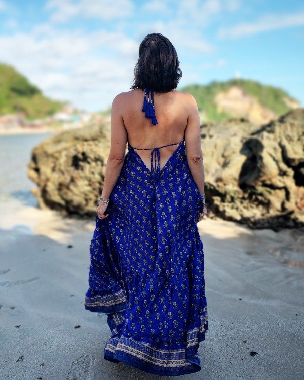 • Espalda abierta con lazos para anudar al cuello y lazos regulables bajo busto