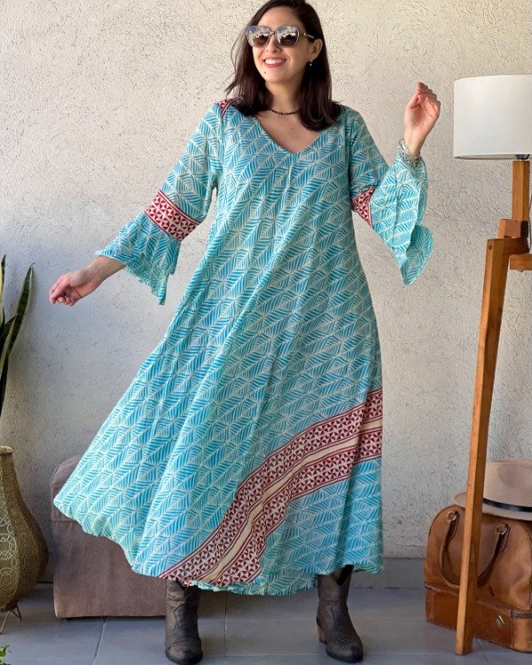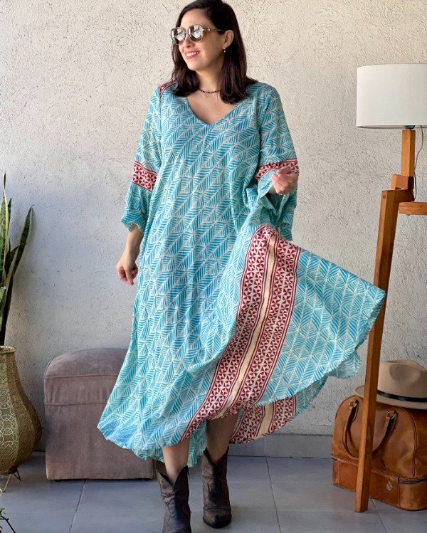 Túnica Boho Algodón Turquesa y Tomate L a 2XL