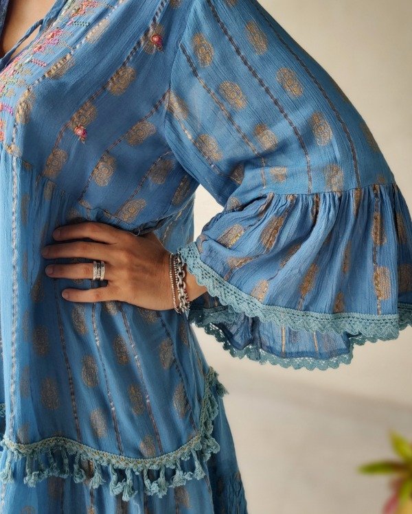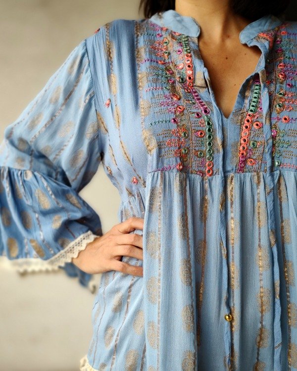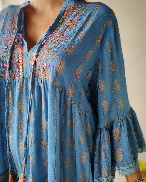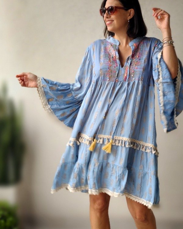 - Vestido estilo Folk 100% algodón indio, línea Gold, con detalles dorados en su estampa.
