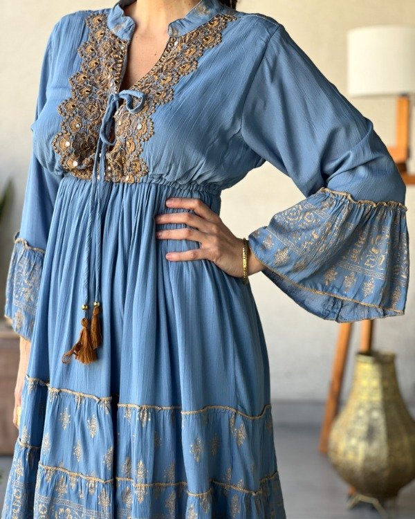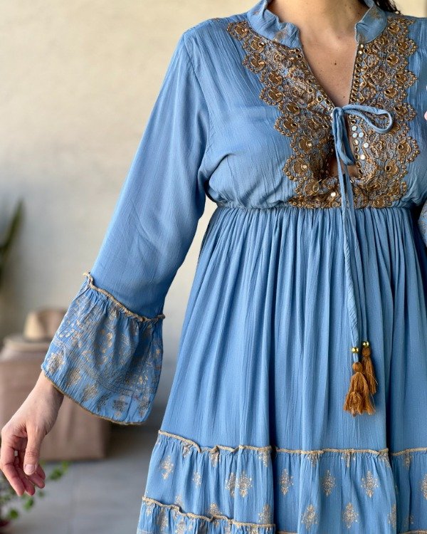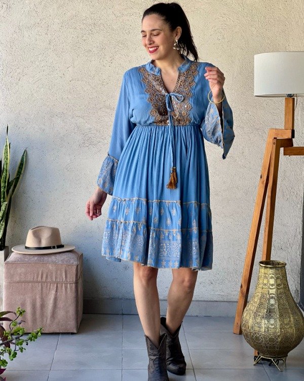 • Vestido estilo Folk 100% algodón indio, línea Gold, con detalles dorados en su estampa.