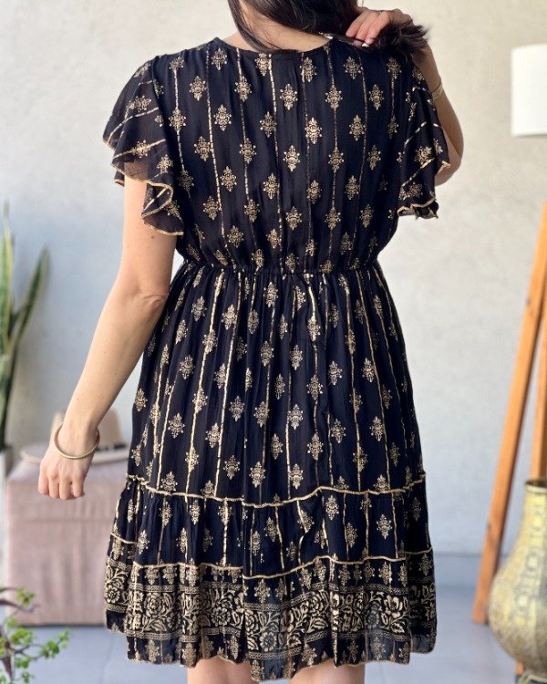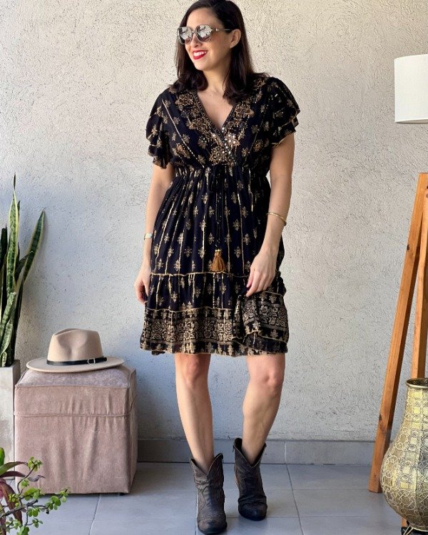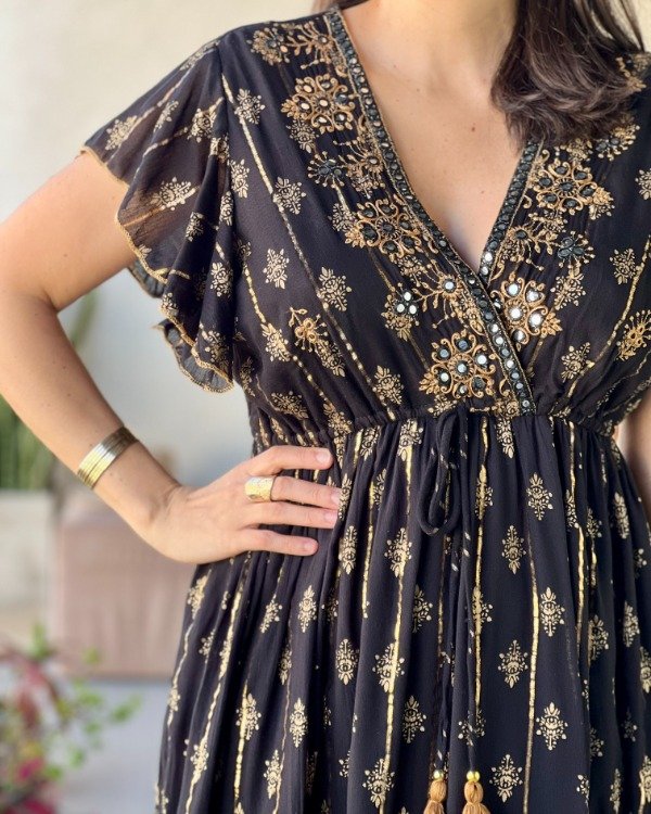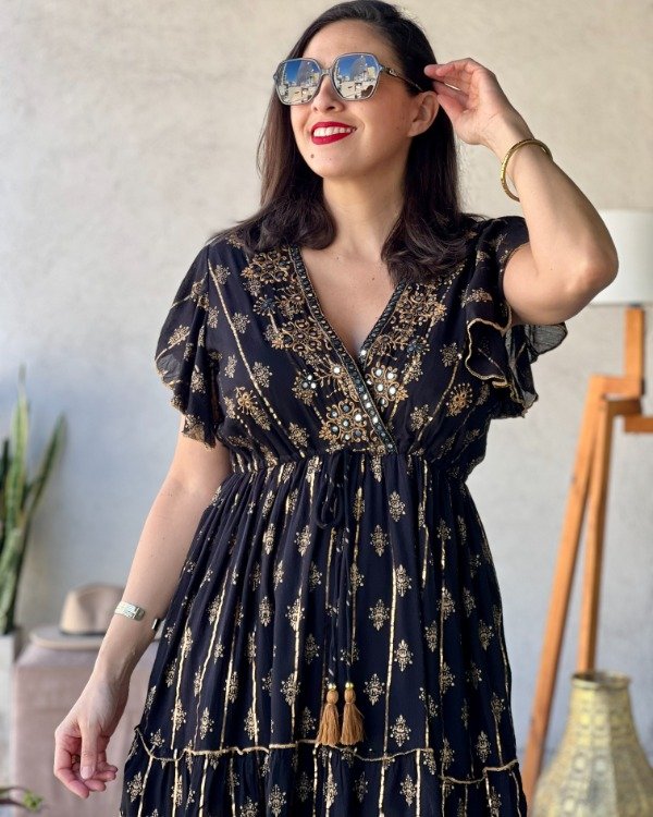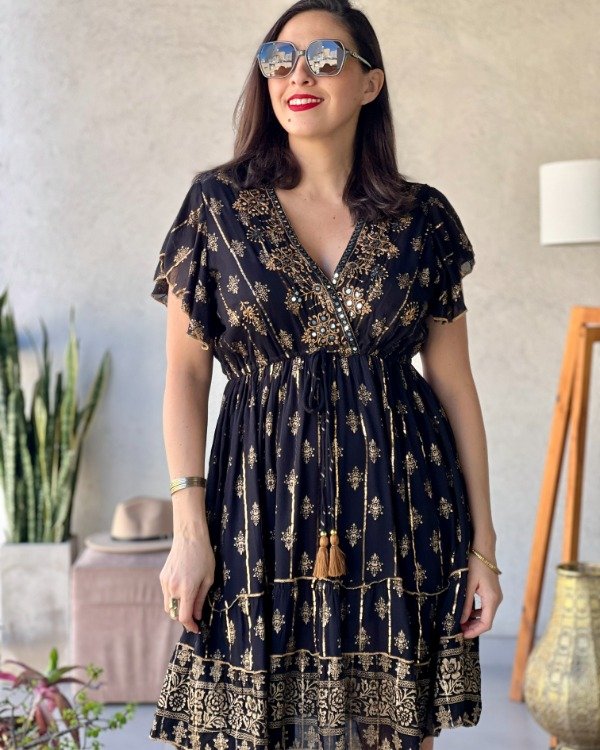 - Vestido estilo Folk 100% algodón indio, línea Gold, con detalles dorados en su estampa.
