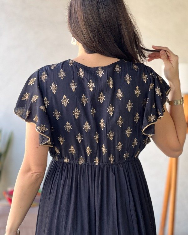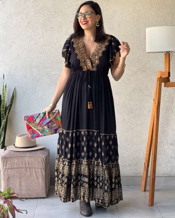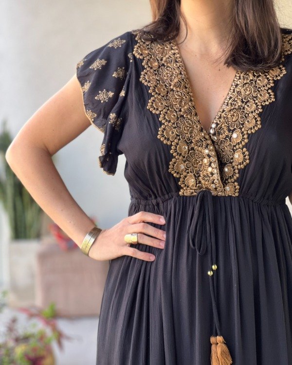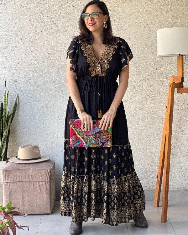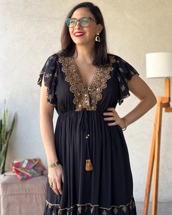 - Vestido de algodón Indio con detalles bordados en pechera y detalles línea Gold en faldón.